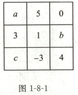 7. 如图 1-8-1 所示的九宫格内,每行、每列、每条对角线上的三个数之和相等,则$a + b - c$的值为(