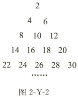 5. (2024 绵阳)如图 2-Y-2,将全体正偶数排成一个三角数阵,从上向下数有无数多行,其中第一行有 1 个数为 2,第二行有 2 个数为 4,6……第 $n$ 行有 $n$ 个数,探究其中规律,你认为第 $n$ 行从左至右第 3 个数不可能是(