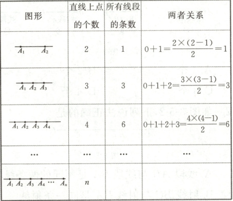 11. 新考法 探究性 阅读:在直线上有 $ n $ 个不同的点,则此图中共有多少条线段?通过分析、画图尝试得到如下表格: