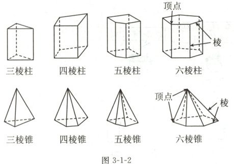 3. 如图 3 - 1 - 2,棱柱有三棱柱、四棱柱、五棱柱、六棱柱……棱锥也有三棱锥、四棱锥、五棱锥、六棱锥……在棱柱和棱锥中,相邻两个面的交线叫做