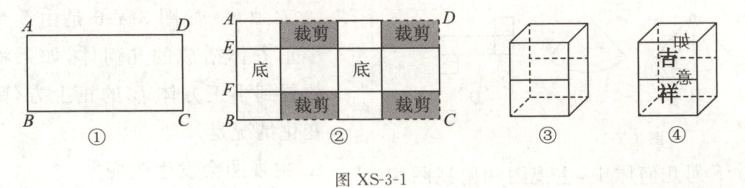 (2024 福建节选)在手工制作课上,老师提供了如图 XS-3-1①所示的长方形卡纸 $ABCD$,要求大家利用它制作一个底面为正方形的礼品盒. 小明按照图②的方式裁剪(其中 $AE = FB$),恰好得到纸盒的展开图,并利用该展开图折成一个礼品盒,如图③所示.