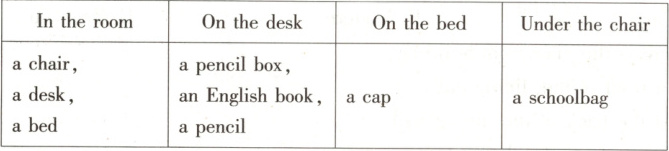 This is Cindy’s room. You can see a chair,a desk and a bed in it.The desk is next to the bed. It is white. And white is her favourite colour. There is a pencil box,an English book and a pencil on the desk. Cindy likes English very much. Look! Cindy’s cap is on the bed. The cap is very nice. A schoolbag is under the chair. Her room is not big,but it’s very tidy.