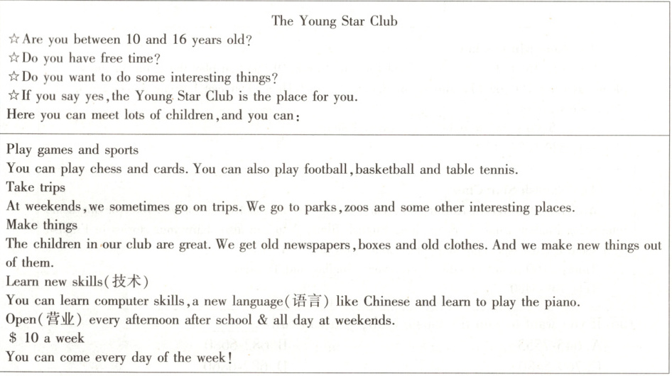 62.C[提示:细节理解题。根据“Are you between 10 and 16 years old?”可知,12岁的孩子可以加入这个俱乐部。故选C。] 63.C[提示:细节理解题。根据“learn to play the piano”可知,在这个俱乐部能学习弹钢琴。故选C。] 64.D[提示:细节理解题。根据“Open every afternoon after school & all day at weekends.”可知,在周末,这个俱乐部是全天开放的。故选D。] 65.C[提示:细节理解题。根据“Open every afternoon after school & all day at weekends.”可知,每天都能去这个俱乐部。故选C。]