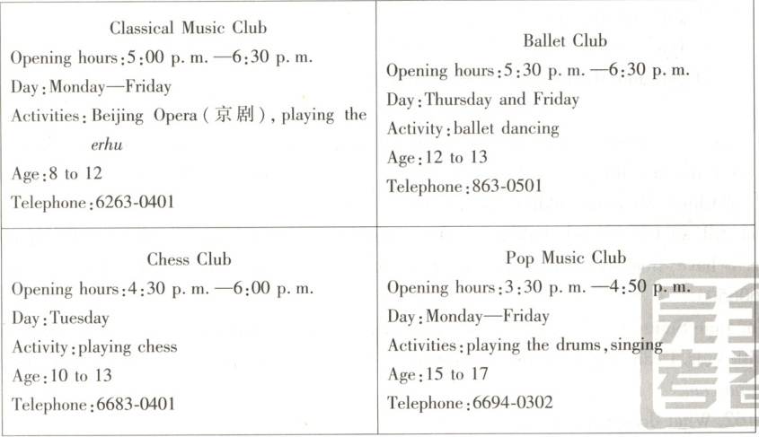 )56. Where can you go if you have time from 3:00 to 5:00 in the afternoon?A. The classical music club. B. The ballet club.