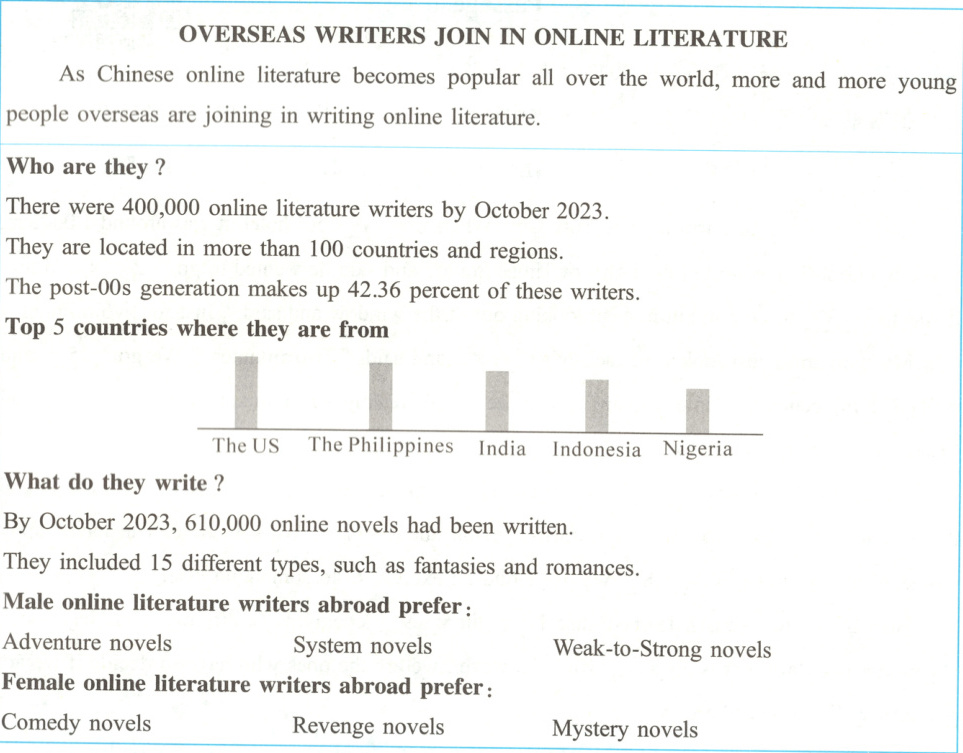 本文为应用文,阐述了随着中国网络文学在世界范围内的流行,越来越多的海外年轻人加入到网络文学创作中来,本文还介绍了他们是谁、写作内容等相关信息。