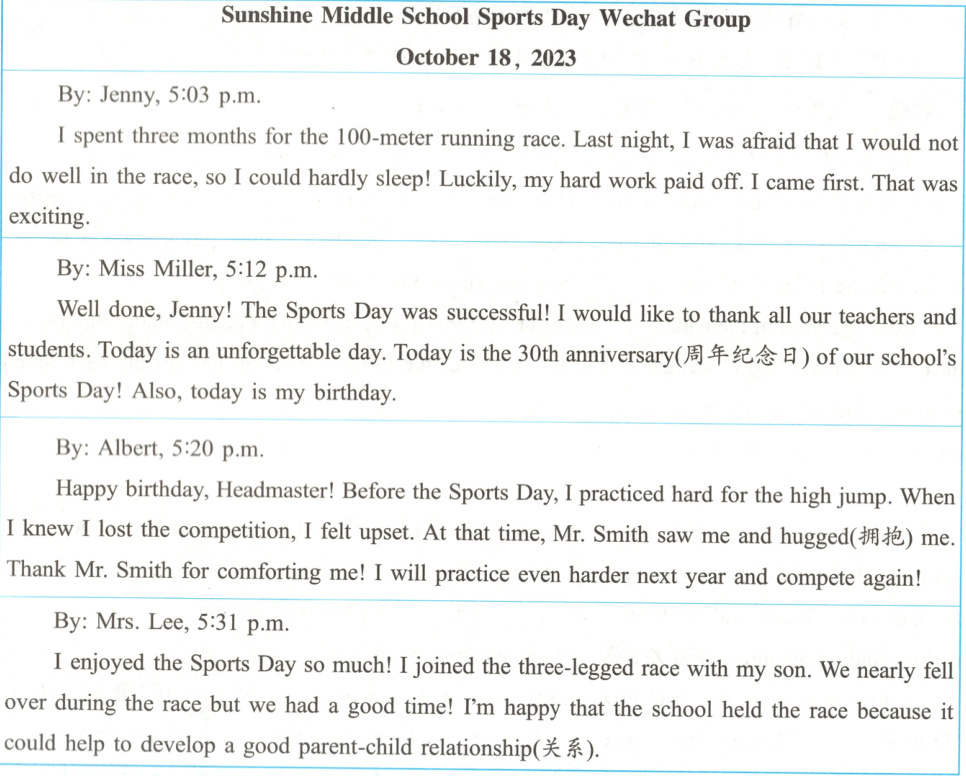 5.C。细节理解题。根据表格第一栏 Sunshine Middle School Sports Day Wechat Group 和 October 18, 2023 可知,校运动会是在 2023 年 10 月 18 日。故选 C。