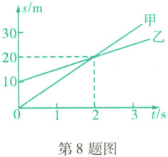 8.CD [解析]由题图像知,甲、乙两车在平直公路上同向行驶,乙在甲前10m处开始行驶,2s时甲追上乙,故D说法正确;甲、乙通过的路程与时间成正比,即甲、乙两物体都做匀速直线运动,故B说法错误;甲、乙两车的速度v甲=$\frac{s_{甲}}{t_{甲}}$=$\frac{20m}{2s}$=10m/s,v乙=$\frac{s_{乙}}{t_{乙}}$=$\frac{10m}{2s}$=5m/s,故A说法错误;由于甲车的速度大于乙车的速度,以甲车为参照物,乙车相对于甲车向后行驶,故C说法正确。