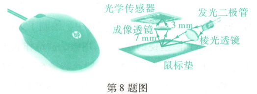 8.ACD 【解析】当发光二极管的光照射在粗糙的鼠标垫上时,反射光线会射向各个方向,因此会发生漫反射,故A正确;棱光透镜是凸透镜,对光有会聚作用,故D正确;由题意可知,当鼠标平放在鼠标垫上,成像透镜距鼠标垫$7\ mm$,光学感应器距成像透镜$3\ mm$,即物距大于像距,因此,成倒立、缩小的实像,与照相机的成像原理相同,故C正确、B错误。