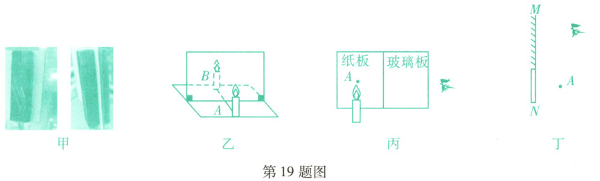 小明用纸板挡住玻璃板一部分,让小丽从侧面观察玻璃板,如图丙所示,发现通过玻璃板能看到被纸板挡住的蜡烛。经过讨论,他们以作图的方式得到了解答,请你在图丁中作出小丽眼睛看到蜡烛A的光路。
