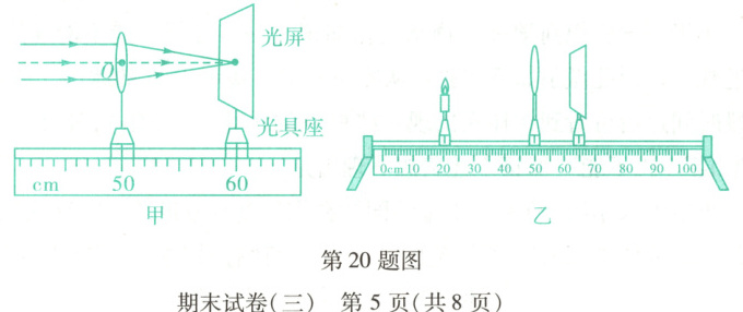 (4)某次实验中将蜡烛放在20 cm刻度线处,凸透镜固定在50 cm刻度线处,在图乙的光屏上恰巧出现清晰的像,若保持蜡烛和光屏的位置不变,向左移动透镜到 cm刻度线处能再次接收到清晰的像。