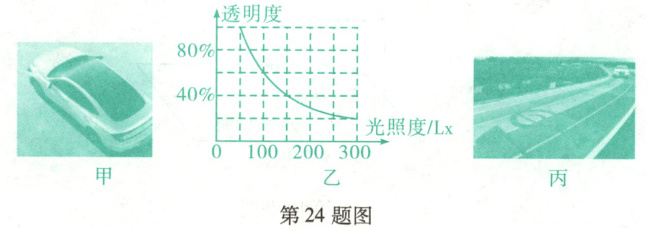 ②物体单位面积上得到的光的量,用光照度表示。"智能玻璃"能根据车外光照度自动调节透明度,实现车内的光照度为一个适宜的定值。透明度是指车内光照度与车外光照度的比值,经测算玻璃的透明度和车外光照度的关系图像如图乙所示。玻璃的透明度随车外的光照度的增加而