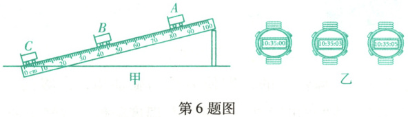 6.D 【解析】A.斜面的坡度越大,小车在斜面上滑下的速度越快,在斜面上的运动时间越短,越不方便测量时间,因此斜面应保持较小的坡度,以便于测量时间,故A错误;B.$AB$段的距离$s_{AB}=80.0\ cm - 40.0\ cm = 40.0\ cm$,所用时间$t_{AB}=10:35:03 - 10:35:00 = 3\ s$,$AB$段平均速度$v_{AB}=\frac{s_{AB}}{t_{AB}}=\frac{40.0\ cm}{3\ s} \approx 13.3\ cm/s$,故B错误;C.$s_{BC}=40.0\ cm - 0\ cm = 40.0\ cm$,$t_{BC}=10:35:05 - 10:35:03 = 2\ s$,$BC$段平均速度$v_{BC}=\frac{s_{BC}}{t_{BC}}=\frac{40.0\ cm}{2\ s}=20.0\ cm/s$,因为$v_{BC} > v_{AB}$,所以小车从A点到C点做加速直线运动,故C错误;D.如果小车过了A点才开始计时,测量的时间会偏小,根据速度公式$v = \frac{s}{t}$可知,测得的平均速度会偏大,故D正确。