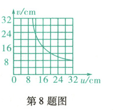 8.BD 【解析】A.当$u = v = 2f$时,凸透镜成倒立、等大的实像,由题图像得,$u = v = 2f = 16\ cm$,所以$f = 8\ cm$;B.当$v = 20\ cm$时,像距大于二倍焦距,凸透镜成放大的像,其应用是投影仪;C.当$u = 12\ cm$时,物距在一倍焦距和二倍焦距之间,成倒立、放大的实像;D.把物体从距凸透镜$12\ cm$处移动到$24\ cm$处的过程中,物距变大,像距变小,像逐渐变小。