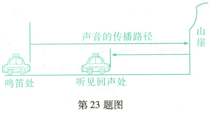 (3)当司机再次鸣笛刚好听不到回声时,声音传播的路程s'_声 = v_声t' = 340 m/s × 0.1s = 34m,车行驶的路程s'_车 = v_车t' = 20 m/s × 0.1s = 2m,刚好听不到回声的鸣笛处到山崖的距离$s' = \frac{s'_声 + s'_车}{2} = \frac{34 m + 2 m}{2} = 18m,$汽车需要向前行驶的路程s''_车 = s - s' = 360m - 18m = 342m,汽车需要向前行驶的时间$t'' = \frac{s''_车}{v_车} = \frac{342 m}{20 m/s} = 17.1s。$