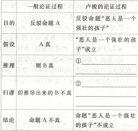 ①处:分析“推理”部分,已知假设“恶人是一个强壮的孩子”成立(A真)。在文本中,卢梭根据这个前提进行的推理是“野蛮人是否也是一个强壮的孩子?如果我们承认他是一个强壮的孩子”,可知此处推理出野蛮人也是一个强壮的孩子,故应填写:则“野蛮人是一个强壮的孩子”成立。