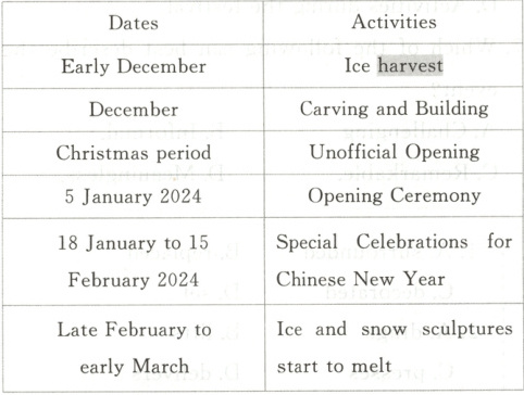 Every year, there is a special theme for the Ice Festival. A huge Snowflake Ferris Wheel(摩天轮) has already been built inside the park. Visitors are able to ride on the Ferris Wheel and overlook the ice castles. For this upcoming festival, the highlight may be when the giant Snowflake is colourfully lit up at night, shining high in the sky.