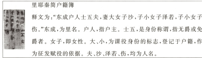 4.C 【详解】据图片内容可知,这是秦朝的户籍簿,它的内容包括家庭成员关系、名字、社会上的身份称谓等,体现了秦朝对基层实施严密的管理措施,C项正确;图片内容是秦朝的户籍信息,并以此“作为征发赋役的依据”,未涉及赋税制度的负担大小,排除A项;图片内容是秦朝的户籍信息,未涉及秦朝法律严酷与否,排除B项;图片内容是秦朝的户籍信息,“女子地位的提高”与历史事实不符,排除D项。