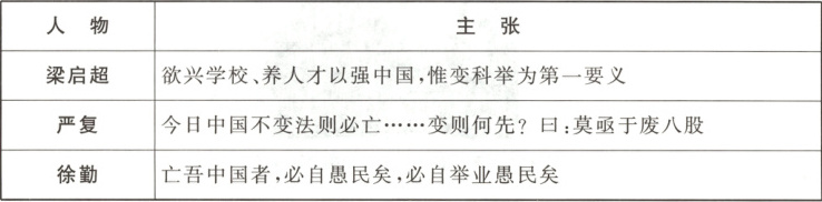 8.A 【详解】材料中三位知识分子的主张都涉及科举制度,梁启超和严复更是直接提出了改革科举或废除八股的具体建议,这表明当时改革科举已成为一种迫切的社会需求,A项正确;表格中严复明确支持废除八股,梁启超也主张改革科举(暗示了对八股的不满),而徐勤的言论更是对科举制度的批判,没有信息显示废除八股取士遭到了强烈反对,排除B项;仅凭部分知识分子的变法主张,不足以断定变法拥有广泛的社会基础,排除C项;表格中的信息确实反映部分知识分子要求改革科举制度的呼声,但并没有直接证据表明科举选官制度在当时已经开始发生嬗变,排除D项。