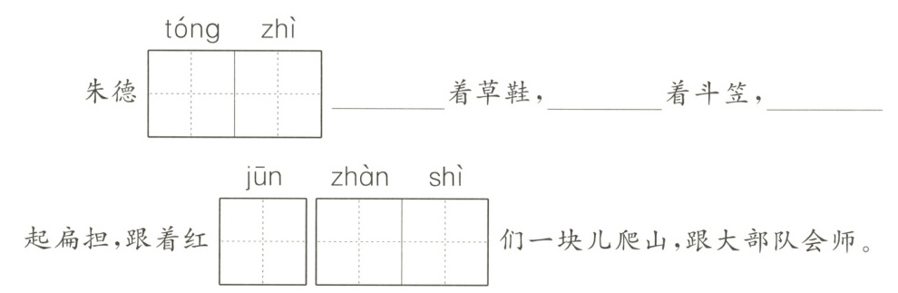 一、请阅读下面关于朱德同志的故事,根据拼音写字词,并在“①戴;②挑;③穿”中选词填空(填序号)。