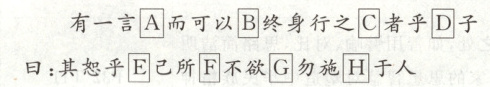 解析 句意:“有没有可以终身奉行的一个字呢?”孔子回答说:“那就是‘恕’吧!自己不愿意的,不要强加给别人。”“有一言而……者乎”是一个完整的疑问句,“乎”是疑问句尾语气词,其后断开;“其恕乎”是一个表推测语气的句子,“其”位于句首表推测,“乎”是句尾语气词,“乎”后断开;“己所不欲”与“勿施于人”是主谓句,“己所不欲”作主语,其后停顿,表强调。