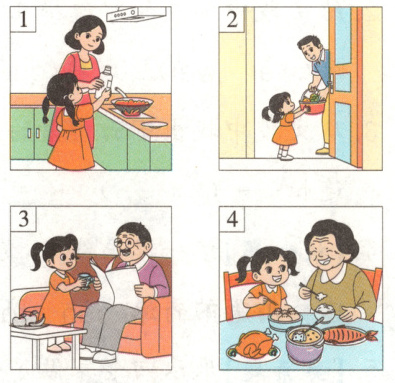 提示:本题考查语言表达能力。先仔细看图,找出小文回家后分别做了哪些事情,然后按顺序写下来。描述时要用上恰当的动作描写,写出小文做事情的过程,还要用上语言描写,写出小文的乖巧懂事及其快乐的心情。