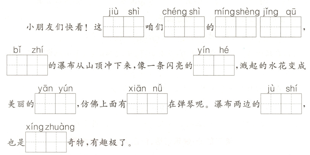 1. 【情境考查】读下面一位小导游的介绍,根据拼音写词语。(10分)