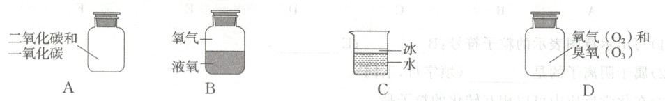 2.B 解析:二氧化碳和一氧化碳是两种物质,A是由两种物质组成的混合物;氧气和液氧是一种物质,只由氧元素组成,B 属于纯净物中的单质;冰和水是一种物质,由氢和氧两种元素组成,C属于纯净物中的化合物;氧气和臭氧是两种物质,D 是由两种物质组成的混合物。