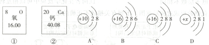 5. (2024·聊城月考)元素周期表及原子结构示意图是学习和研究化学的重要工具。①②均为元素周期表的一格,A~D 为粒子的微观示意图,请根据图示回答: