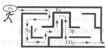 (2)①由于氧气能与木炭反应,不能够与水和氮气反应,所以甲处的物质是木炭。②氧气在进迷宫过程中,碰到了三种能阻止它前进的物质,分别是铁、木炭和磷,氧气与三种物质反应的基本反应类型都是化合反应,反应类型相同。③铁丝在氧气中燃烧生成四氧化三铁。