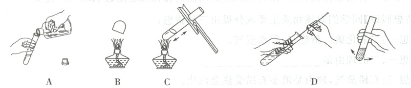14.D 解析:酒精灯内有酒精蒸气,还可能混有空气,用嘴吹灭时,会把火吹入灯内,引起灯内酒精与空气的混合气体燃烧甚至爆炸,故A错误;烧得过热的玻璃试管不要立即用冷水冲洗,否则试管会骤冷而破裂,故B错误;实验后将废液缸内的废液倒入下水道有可能会腐蚀下水道,故C错误;试管放在酒精灯上加热时,需先预热,防止骤热时发生炸裂,操作正确,故D正确。