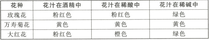 花汁,不选用其他花汁的原因是无法将酸性、碱性、中性溶液完全区分开