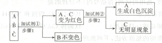 解析:从步骤1发生的现象可知,加入的试剂①应为酚酞试液,由于A、C两溶液均能与试剂①作用得红色溶液,可知A、C分别为NaOH和Ca(OH)₂溶液中的一种,那么B只能为盐酸;步骤2中加入试剂②可将NaOH和Ca(OH)₂两溶液鉴别开,由于CO₂或Na₂CO₃能与Ca(OH)₂反应得白色沉淀CaCO₃,由此推知A为Ca(OH)₂溶液,C为NaOH溶液,试剂②为CO₂或Na₂CO₃。