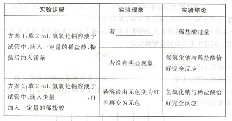 (4)方案1:根据实验结论稀盐酸过量,镁和稀盐酸反应生成氯化镁和氢气,若不产生气泡,则说明稀盐酸过量。方案2:根据实验结论氢氧化钠与稀盐酸恰好完全反应,以及实验现象溶液由无色变为红色再变为无色,则取2mL氢氧化钠溶液于试管中,滴入少量无色酚酞试液,氢氧化钠溶液显碱性,能使酚酞试液变红,再加入一定量的稀盐酸,稀盐酸和氢氧化钠反应生成氯化钠和水,可观察到溶液由红色逐渐变为无色。