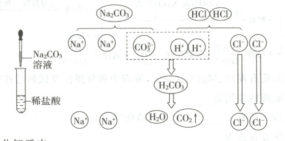 14.B 解析:该反应是碳酸钠和盐酸反应生成氯化钠和碳酸,碳酸再分解生成水和二氧化碳,是两种化合物互相交换成分生成另外两种化合物的反应,属于复分解反应,A项错误;该反应中,氯离子和钠离子在反应前后都没有发生变化,说明该反应是碳酸根离子和氢离子反应生成二氧化碳和水,B项正确;该反应中,碳酸根离子和氢离子反应生成水和二氧化碳,水分子数量增加,钠离子、氯离子数量没有变化,C项错误;碳酸钠过量时,溶液中含有碳酸钠和氯化钠,溶液呈碱性,D项错误。