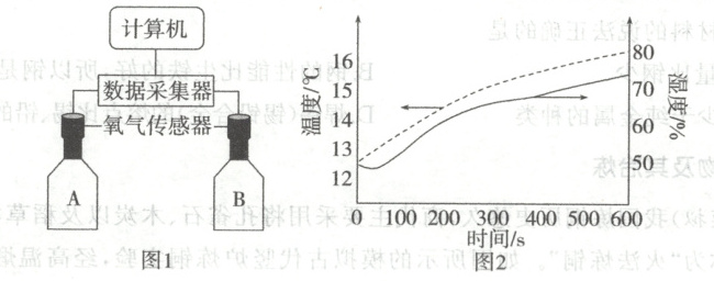 (填序号)。(4)在两只试剂瓶中均加入第二组试剂,分别改用温度和湿度传感器测得结果如图 2 所示。瓶内湿度随时间增大(即水蒸气含量增大),根本原因是
