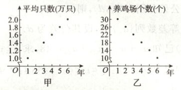 甲调查表明:从第1年平均每个养鸡场出产1万只鸡上升到第6年平均每个养鸡场出产2万只鸡。乙调查表明:由第1年养鸡场30个减少到第6年养鸡场10个。