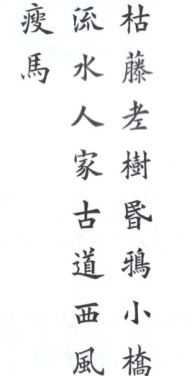 赏析:这几句出自《天净沙·秋思》,其句法别致,皆由(词性)构成,语言凝练却意蕴丰富,这三句共列出(填数量)种景物,描绘了一幅苍凉凄苦的秋风萧瑟之景,抒发了一个漂泊天涯的游子在秋天思念故乡、倦于漂泊的凄楚愁苦之情。