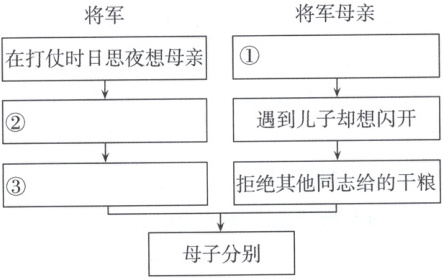 (4)示例:朱德的母亲支持儿子走上革命的道路,在儿子遇到困难时给予慰勉。本文中的母亲十分想念儿子,却从不对乡亲说儿子是抗日将领;希望碰见儿子,可真碰上了,又躲开,怕儿子为自己分心。由此可见,两位母亲都理解子女、深明大义、顾全大局、默默奉献,都有着崇高的家国情怀和民族责任感。