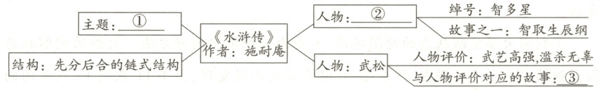 (1) 为更好地展现梁山好汉的英雄故事,班里同学想要绘制《水浒传》的思维导图。请调动你的阅读积累,在图中的横线上补写相应内容。(6分)