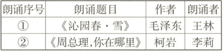 (3)示例一:选择《沁园春·雪》。有一首词,以咏雪起兴,赞美祖国的山河,评论祖国的历史,歌颂祖国的今天与未来,脍炙人口,古今绝唱,这就是毛泽东的《沁园春·雪》。下面请欣赏王林带来的诗朗诵《沁园春·雪》。