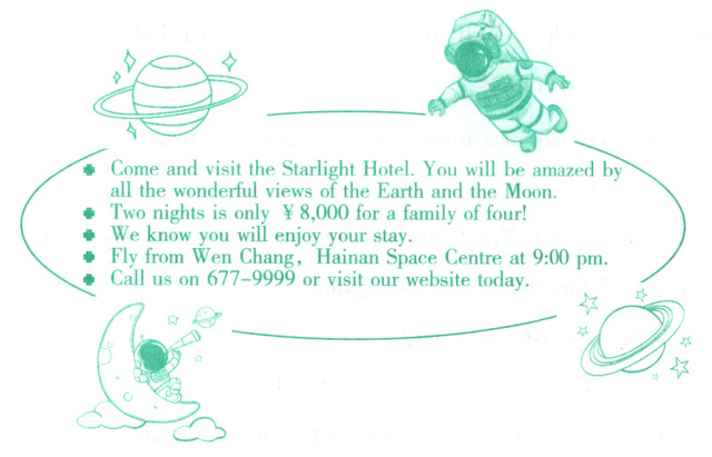 4.细节理解题。根据广告第一句可知,在Starlight酒店住宿可以欣赏到地球和月亮的景观。故选B。