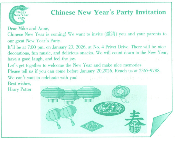 3.细节理解题。根据“Please call us if you can come before January 20, 2026.”可知,如果参加聚会,需要在2026年1月20日前打电话。故选A。
