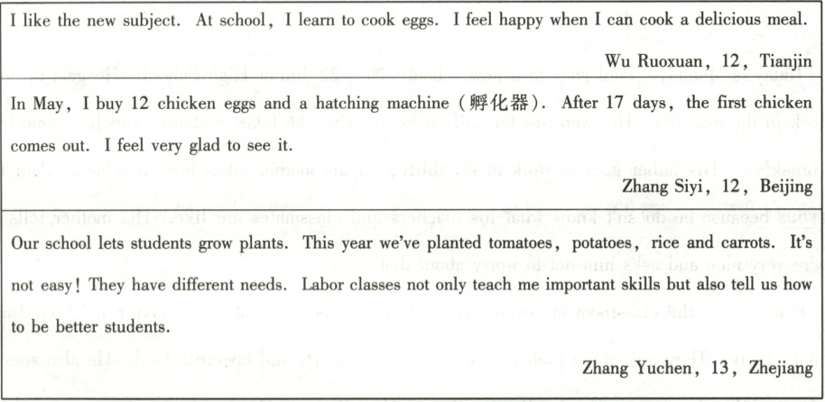 Do you know how to cook, clean or grow plants? You will soon learn these skills (技能)! Since the year of 2022, primary and middle schools have had labor education (劳动教育). Every week, students have at least one class to learn about cooking, keeping animals and more. This can make Chinese students' life great. According to a 2019 report, Chinese kids only did 12 minutes of practical (实际的) activities each day. So, how do young people feel about the new subject? Let's look at it!