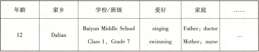 45. (大连市旅顺口区期末)假定你是李辉,今天是第一次英语课,老师让你用英语做个自我介绍。请根据下表中的信息介绍自己。