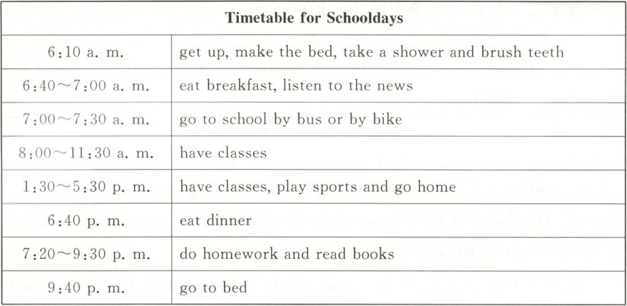 We all need a timetable. Some students may say that it is difficult to keep a timetable. But when you do the same activities every day, you will develop a good habit. Soon you will find it easy to keep it. Why not give it a try? Start now!