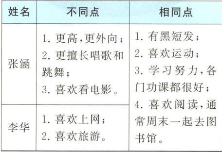 参考范文: My Good Friend I’m Li Hua. My good friend is Zhang Han. We have both similarities and differ- ences. We are the same in some ways. We both have short black hair. We like sports and often play basketball together. We study hard and do well in all subjects. Also, we love reading and usually go to the library on weekends. However, we are different too. Zhang Han is taller and more outgoing than me. He is better at singing and dancing. In his free time, he likes watching movies. I like surfing the Internet and travelling. I think these differences make our friendship special.