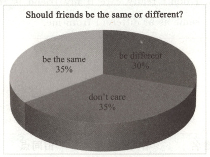 上周,新华中学开展了以“Should friends be the same or different?”为主题的调查活动,下面是他们对全校500名学生调查后的结果。请你根据图表和下面的信息写一篇短文,内容包括以下几点:
