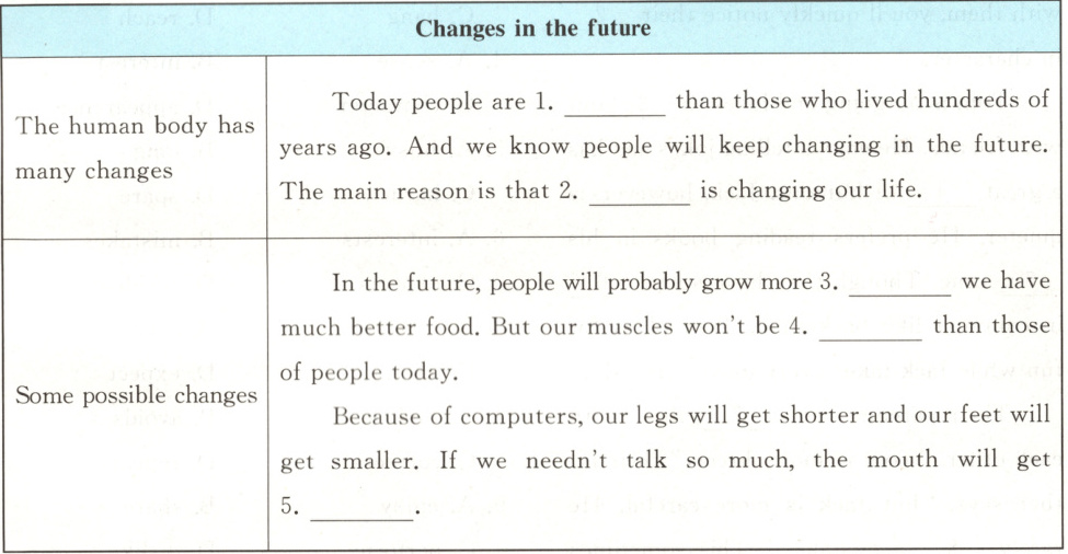 Our muscles(肌肉)will not be as strong as now, because we won’t do a lot of physical work.