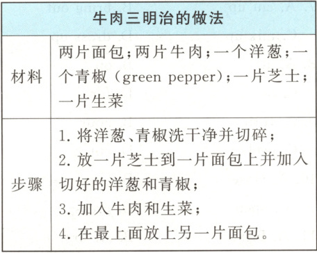 Do you like beef sandwiches? Can you make one by yourself? Let me tell you how to make it. You need these things: two pieces of bread, two pieces of beef, a piece of cheese, an onion, some lettuce and a green pepper. And then you can start. First, wash the onion and the green pep- per. Cut them up and mix them together. Next, put a piece of cheese on one piece of bread. Then, you can put the onion and green pepper on the bread and add two pieces of beef and the lettuce. Finally, put another piece of bread on top. You can enjoy the deli- cious beef sandwich now. It’s easy to make a beef sandwich. Why not have a try?