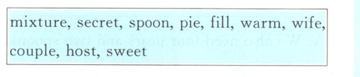 五、1. wife 2. filled 3. pie 4. hostess 5. secrets 6. mixture 7. warm 8. spoons 9. sweetness 10. couple